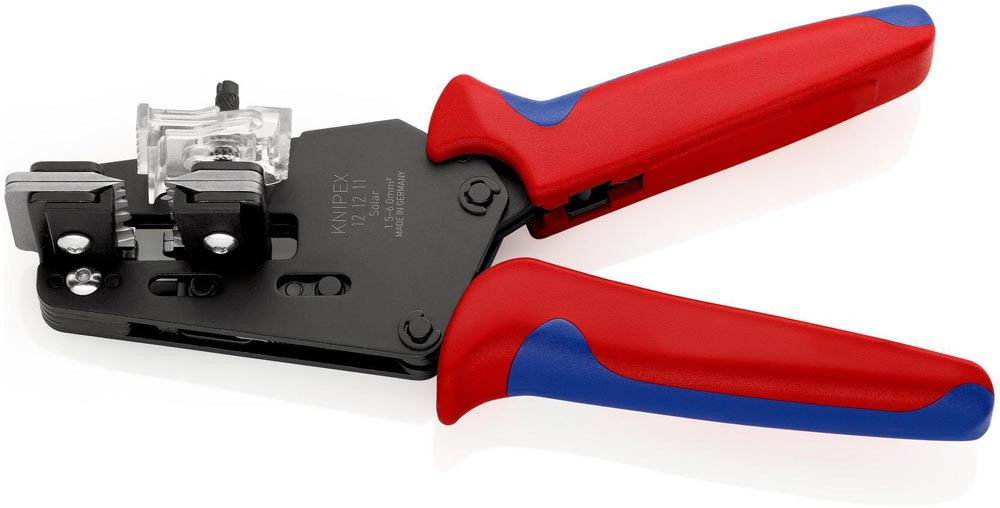 12 12 12 Präzisions-Abisolierzange Formschlüssiges Abisolieren auch von schwer zu entfernenden Isolierwerkstoffen aus PTFE · Silikon · Radox® · Kapton® und Gummi · auch mehrlagig. Ein zweites Messerpaar hält die verbleibende Isolierung zuverlässig fest. Genau auf den jeweiligen Leiterquerschnitt abgestimmte · auswechselbare Formmesser. Mit einstellbarem Längenanschlag für gleiche Abisolierlängen bei Serienarbeit. für Solarkabel · speziell abgestimmt auf mehrlagige und auf Radox®-Isolierungen. mit zusätzlicher Kabelabstützung für eine bessere Zentrierung mehrlagig isolierter Leiter in den Abisolierprofilen. Kapton® ist ein eingetragenes Warenzeichen der E. I. du Pont de Nemours and Company. Radox® ist ein eingetragenes Warenzeichen der Huber & Suhner AG. - Abisolierwerte Quadratmillimeter: 4,0 / 6,0 / 10,0mm² - AWG: 8 / 10 / 12