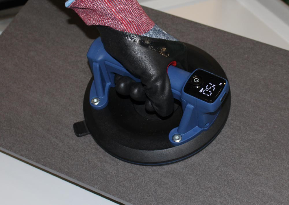 Digitaler Plattenheber mit integrierten Li-Ion-Akku (2,0 Ah) ∙ Zum Anheben von nicht porösen Materialien wie Fliesen, Marmor, Granit und Glas ∙ Saugt automatisch bis zu 200 kg Tragfähigkeit an und stoppt dann automatisch ∙ Vakuumpumpe schaltet sich automatisch wieder ein, wenn der Druck auf 130 kg absinkt ∙ Horizontal und vertikal einsetzbar ∙ Digitale Anzeige zeigt die momentan zu hebende Last (kg) an und den Batteriestatus