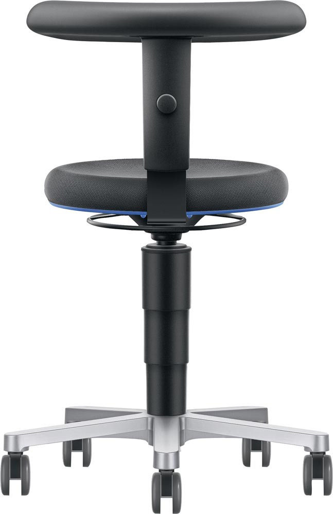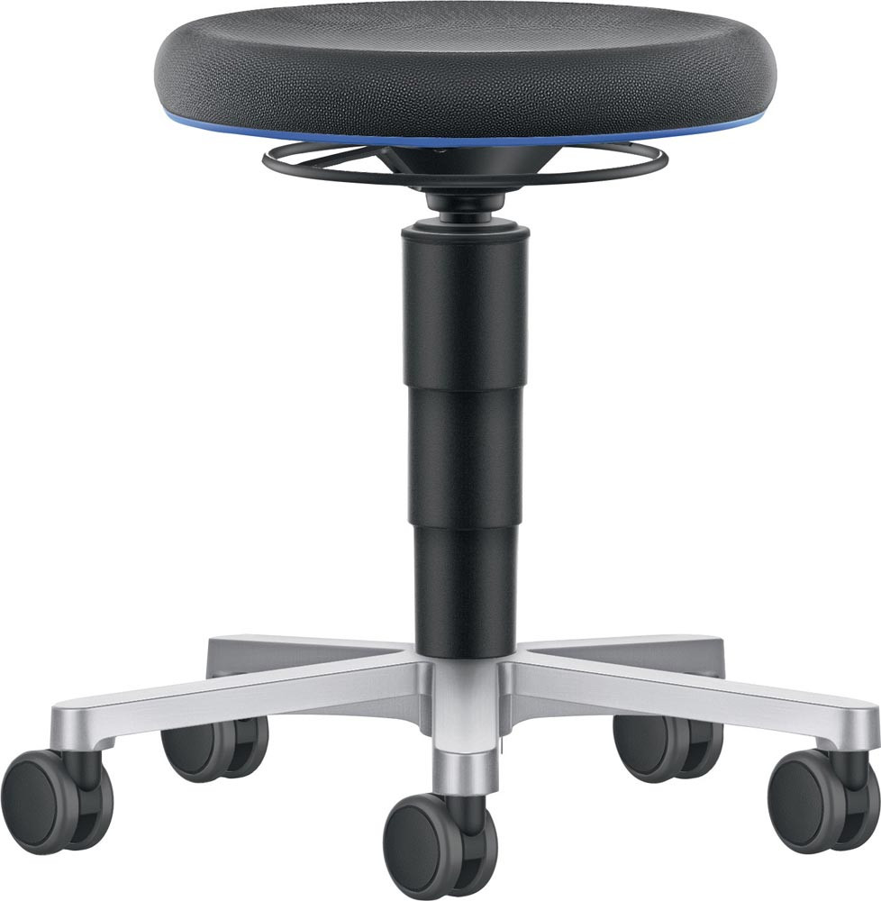nach DIN 68877 · bedienungsfreundliche Gasfeder-Sitzhöhenverstellung mit umlaufender Ringauslösung · blaue Ringabdeckung zum Schutz der Polster · abgerundetes Supertec-Gewebepolster Ø 400 mm, komfortabel, atmungsaktiv, sehr widerstandsfähig durch Mikropanzerung, schnittfest, rutschfest, reinigungsfreundlich · dicke Polsterung für ein komfortables Sitzgefühl · kompaktes Fünffuß-Untergestell aus poliertem Aluminium Ø 500 mm, hygienisch und einfach zu reinigen Untergestell mit extra großen weiche Universalrollen Ø 65 mm für leichtgängiges Rollen über alle Böden