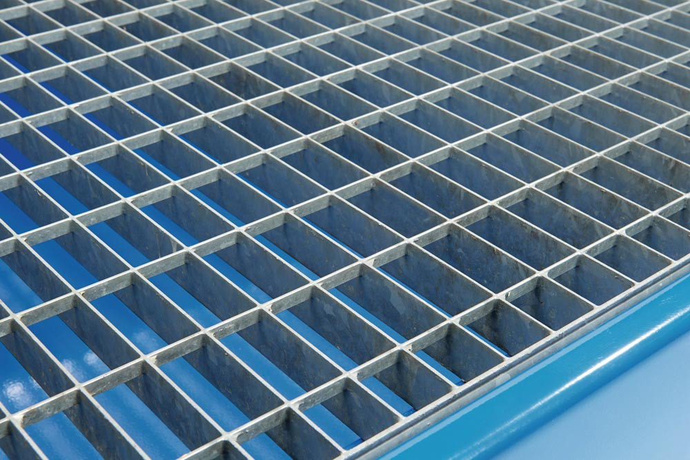 zur Lagerung von 200-l-Fässern oder Kleingebinde · nach Übereinstimmungserklärung (ÜHP) gemäß StawaR, zugelassen für entzündbare Flüssigkeiten der GHS-Kategorien 1-3, gewässergefährdende Flüssigkeiten der GHS-Kategorien 1-4 · robuste 3-mm-Stahlblech-Konstruktion · mit verzinktem Gitterrost · mit Füßen (der Gabelhubwagen muss die Wanne zwischen den Füßen heben) · Tragfähigkeit 1000 kg/m² · Aufwendig verarbeitete Z-Kantung für optimalen Halt des Gitterrostes