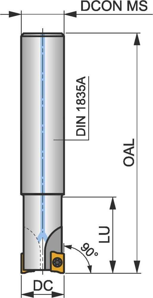 Eckfräser mit positiver/negativer Geometrie zum spannen von 3 Stück ADMX 1606.. oder ADEX 1606.. einseitigen Wendeschneidplatten · Schnittdurchmesser 32mm mit 90° Anstellwinkel und 32mm Zylinderschaft gemäß DIN 1835A · 33mm Funktionslänge 195mm Gesamtlänge · Kühlkanalbohrung zum Kopierfräsen · flachen Schulterfräsen · flachen Nutfräsen · Rampen · Helikalen Fräsen · Tauchfräsen und progressiven Eintauchen mit einer maximalen Schnitttiefe von 13.0mm