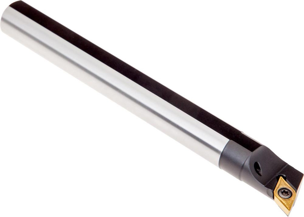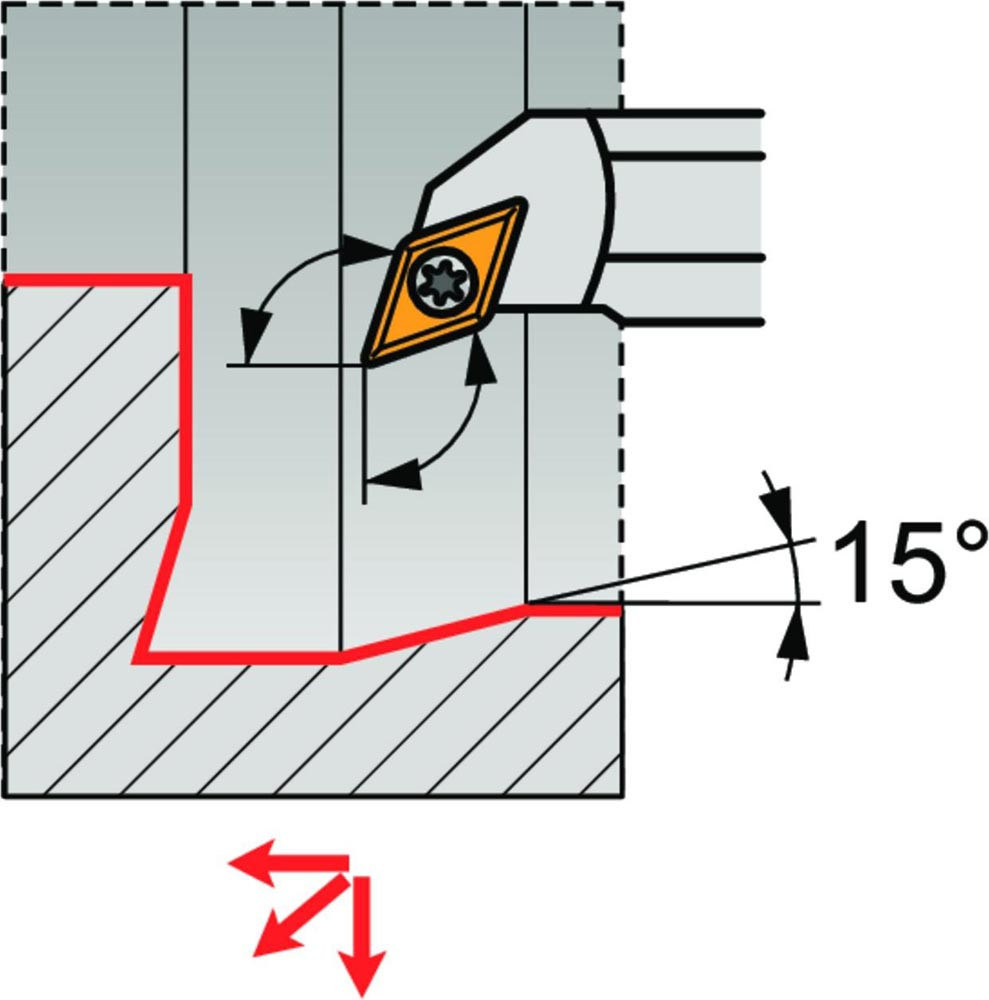 Dreh-Bohrstange mit Schraubklemmung zum spannen von 55° Rhombus positive Wendeschneidplatten mit einem Innenkreisdurchmesser von 9.525mm · 3.97mm Dick (ISO Bezeichnung DC.. 11T3.. ) · linke Ausführung zum 107°30' Längsdrehen mit abgesetzem Schaft · Stahl mit Kühlkanalbohrung · 32mm Durchmesser x 250mm Länge für Innenkegeldrehen und Längsdrehen mit und ohne Schulter