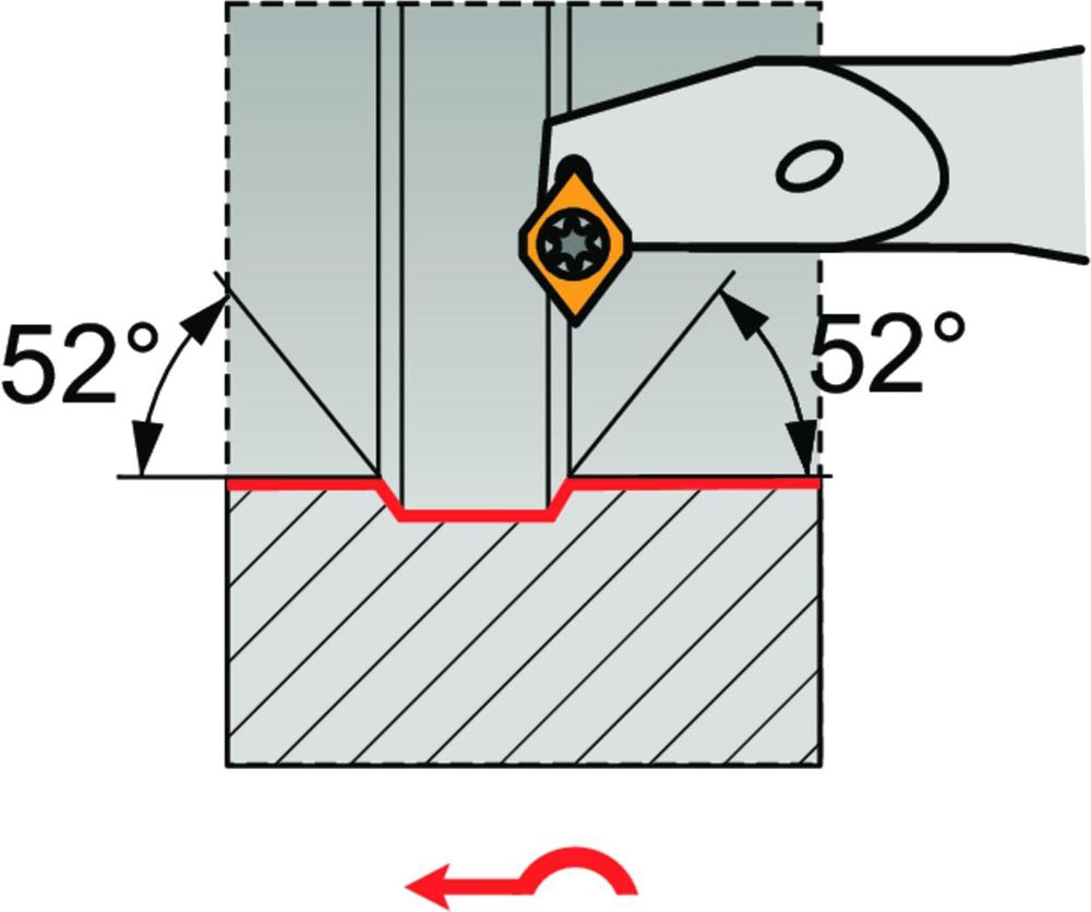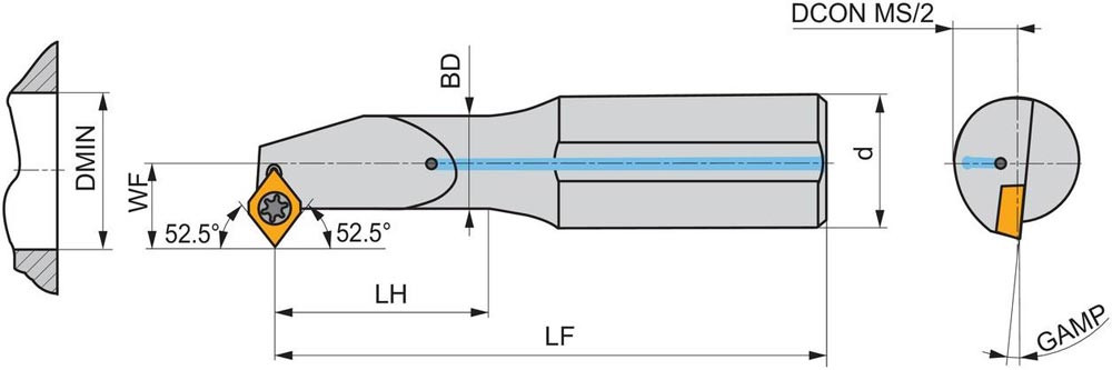 Dreh-Bohrstange mit Schraubklemmung zum spannen von 75° Rhombus positive Wendeschneidplatten mit einem Innenkreisdurchmesser von 5.56mm · 2.38mm Dick (ISO Bezeichnung EP.. 0502.. ) · rechte Ausführung für Sonderanwendungen · Hartmetall mit Kühlkanalbohrung · 6mm Durchmesser x 100mm Länge für Innenkegeldrehen · Kopierdrehen in einer und mehreren Richtungen und Rückwärtsentgraten