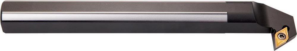 Dreh-Bohrstange mit Schraubklemmung zum spannen von 55° Rhombus positive Wendeschneidplatten mit einem Innenkreisdurchmesser von 9.525mm · 3.97mm Dick (ISO Bezeichnung DC.. 11T3.. ) · linke Ausführung zum Rückwärtsdrehen mit abgesetzem Schaft · Stahl ohne Kühlkanalbohrung · 25mm Durchmesser x 200mm Länge für Rückwärtsentgraten
