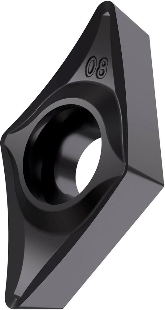 Einseitige positive Drehwendeschneidplatte · 55° Rhombisch mit 7° Freiwinkel · Innenkreisdurchmesser von 9.525mm · 3.97mm Dick · 0.8mm Radius · Indexgenauigkeit nach ISO-Toleranzklasse-G · Spanbrecher SI mit verrundeter Schneidkante · im Substrat T8430 · PVD beschichtet WC-Co Feinkornsubstrat in den ISO-Bereichen P20 -P40 und M20 -M35 · zum schlichten bis medium bearbeiten von Stählen und nichtrostenden Stählen mit einem linksschneidendem Werkzeug