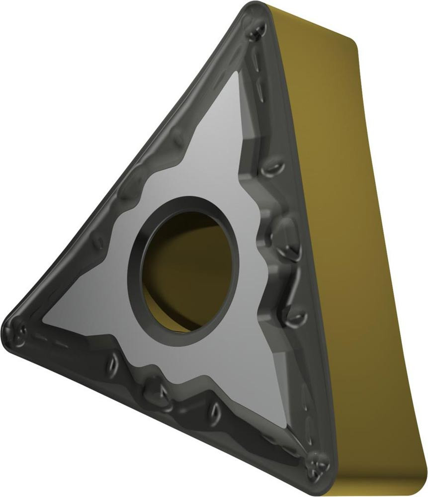 Doppelseitige negative Drehwendeschneidplatte · Triangular mit Innenkreisdurchmesser von 9.525mm · 4.76mm Dick · 0.8mm Radius · Indexgenauigkeit nach ISO-Toleranzklasse-M · Spanbrecher FM mit verrundeter Schneidkante · im Substrat T9415 · MT-CVD beschichtet WC-Co Substrat im ISO-Bereich P05 -P30 · zum schlichten bis medium bearbeiten von Stählen