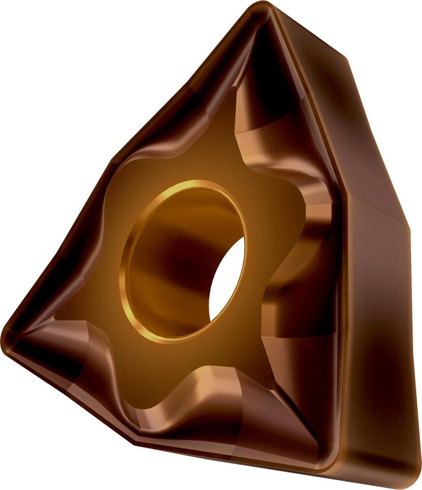 Doppelseitige negative Drehwendeschneidplatte · 80° Trigon mit Innenkreisdurchmesser von 9.525mm · 4.76mm Dick · 0.8mm Radius · Indexgenauigkeit nach ISO-Toleranzklasse-M · Spanbrecher NF mit verrundeter Schneidkante · im Substrat T8430 · PVD beschichtet WC-Co Feinkornsubstrat in den ISO-Bereichen P20 -P40 und M20 -M35 · zum schlichten bis medium bearbeiten von Stählen und nichtrostenden Stählen