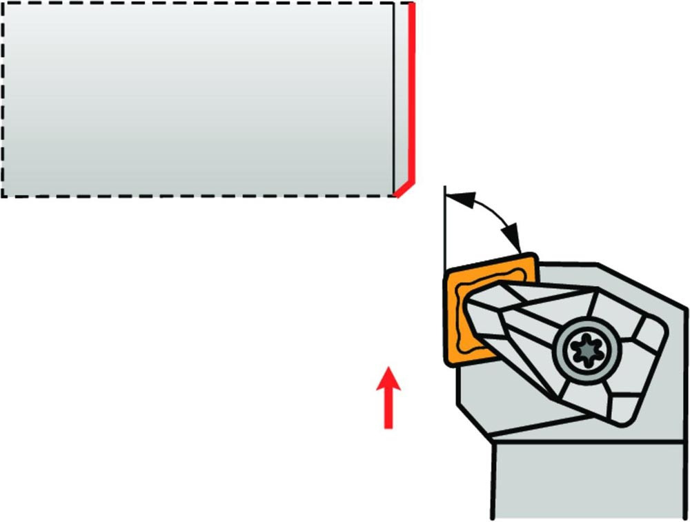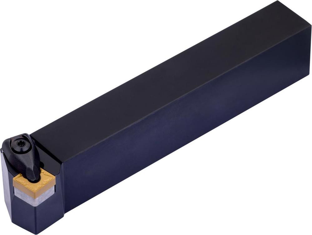 Dreh-Trägerwerkzeug doppelt geklemmt zum spannen von 80° Rhombus negative Wendeschneidplatten mit einem Innenkreisdurchmesser von 12.7mm · 4.76mm Dick (ISO Bezeichnung CN.. 1204.. ) · rechte Ausführung zum 75° Längsdrehen mit abgesetzem Schaft · 25mm Werkzeughöhe x 25mm Breite x 150mm Länge für Stirndrehen ohne Schulter