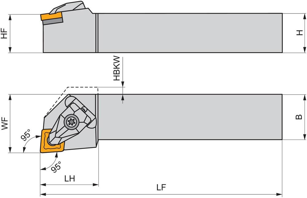 Dreh-Trägerwerkzeug doppelt geklemmt zum spannen von 80° Rhombus negative Wendeschneidplatten mit einem Innenkreisdurchmesser von 19.05mm · 6.35mm Dick (ISO Bezeichnung CN.. 1906.. ) · linke Ausführung zum 95° Stirn-und Längsdrehen mit abgesetzem Schaft · 40mm Werkzeughöhe x 40mm Breite x 250mm Länge für Kegeldrehen · Stirndrehen mit und ohne Schulter und Längsdrehen mit und ohne Schulter
