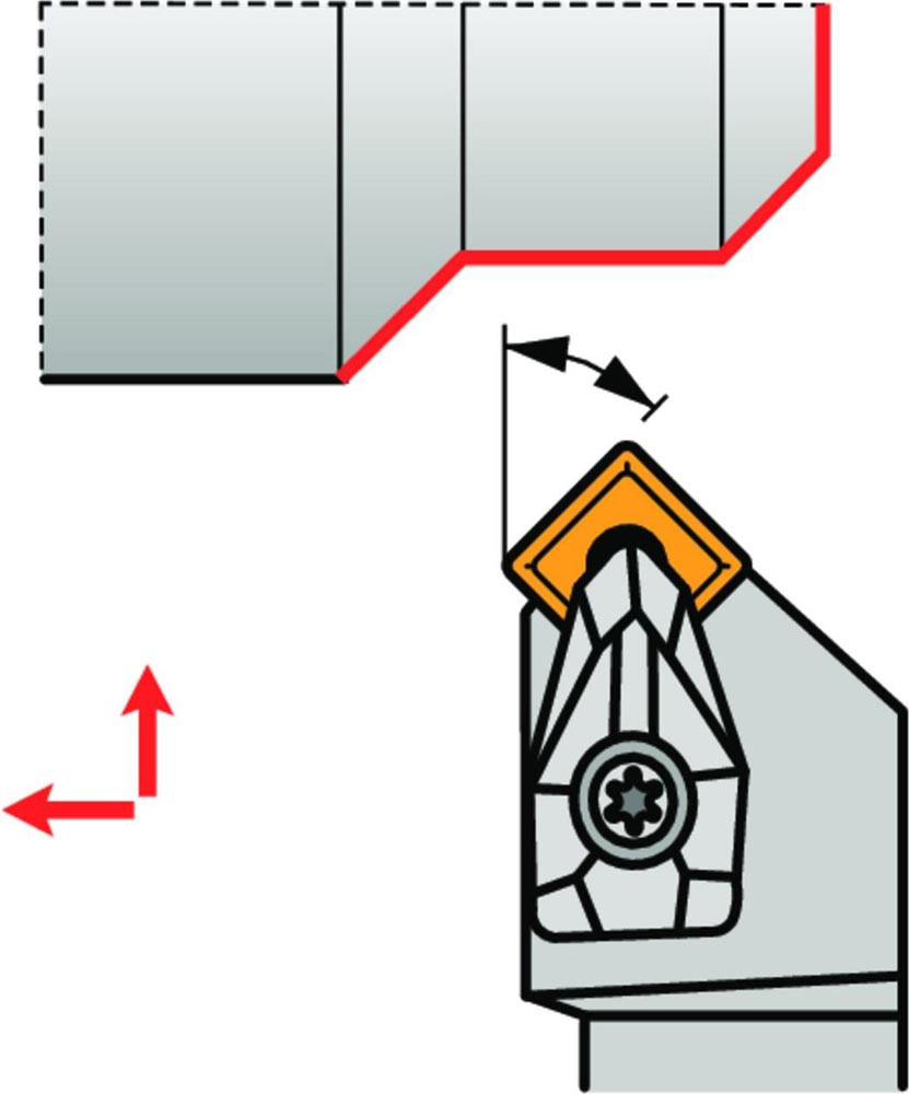 Dreh-Trägerwerkzeug doppelt geklemmt zum spannen von Viereckig negative Wendeschneidplatten mit einem Innenkreisdurchmesser von 15.875mm · 6.35mm Dick (ISO Bezeichnung SN.. 1506.. ) · rechte Ausführung zum 45° Stirndrehen mit abgesetzem Schaft · 32mm Werkzeughöhe x 25mm Breite x 170mm Länge für entgraten · Kegeldrehen · Kopierdrehen in einer und mehreren Richtungen · Stirndrehen ohne Schulter und Längsdrehen ohne Schulter