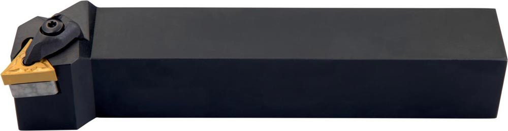 Dreh-Trägerwerkzeug doppelt geklemmt zum spannen von Triangular negative Wendeschneidplatten mit einem Innenkreisdurchmesser von 9.525mm · 4.76mm Dick (ISO Bezeichnung TN.. 1604.. ) · rechte Ausführung zum 90° Stirndrehen mit abgesetzem Schaft · 25mm Werkzeughöhe x 25mm Breite x 150mm Länge für Kegeldrehen und Längsdrehen mit und ohne Schulter