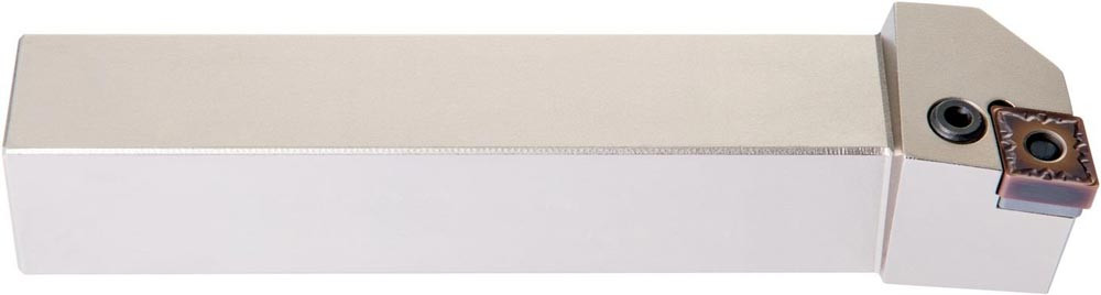 Dreh-Trägerwerkzeug mit Kniehebelklemmung zum spannen von 80° Rhombus negative Wendeschneidplatten mit einem Innenkreisdurchmesser von 12.7mm · 4.76mm Dick (ISO Bezeichnung CN.. 1204.. ) · linke Ausführung zum 95° Stirn-und Längsdrehen mit abgesetzem Schaft · 20mm Werkzeughöhe x 20mm Breite x 125mm Länge für Kegeldrehen · Stirndrehen mit und ohne Schulter und Längsdrehen mit und ohne Schulter