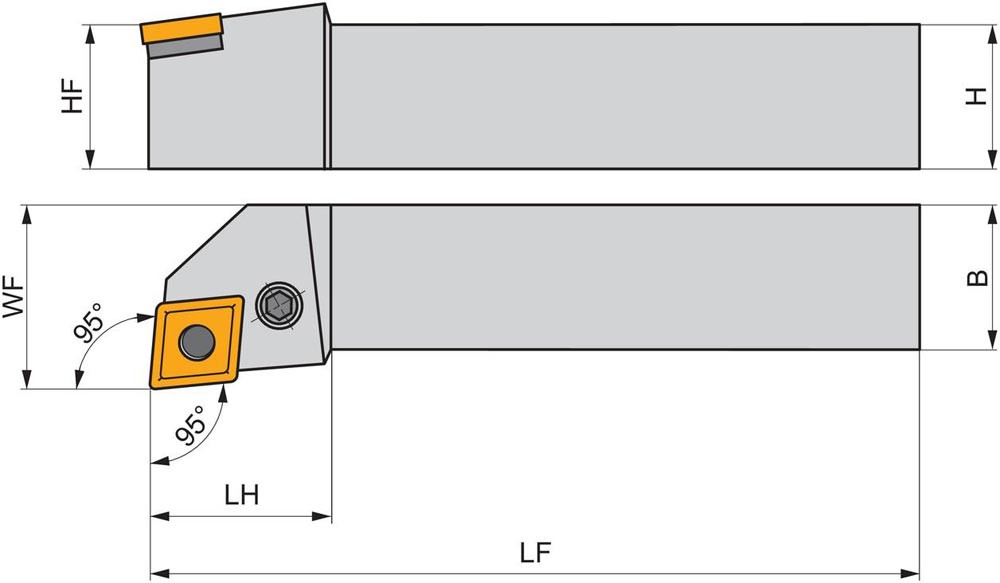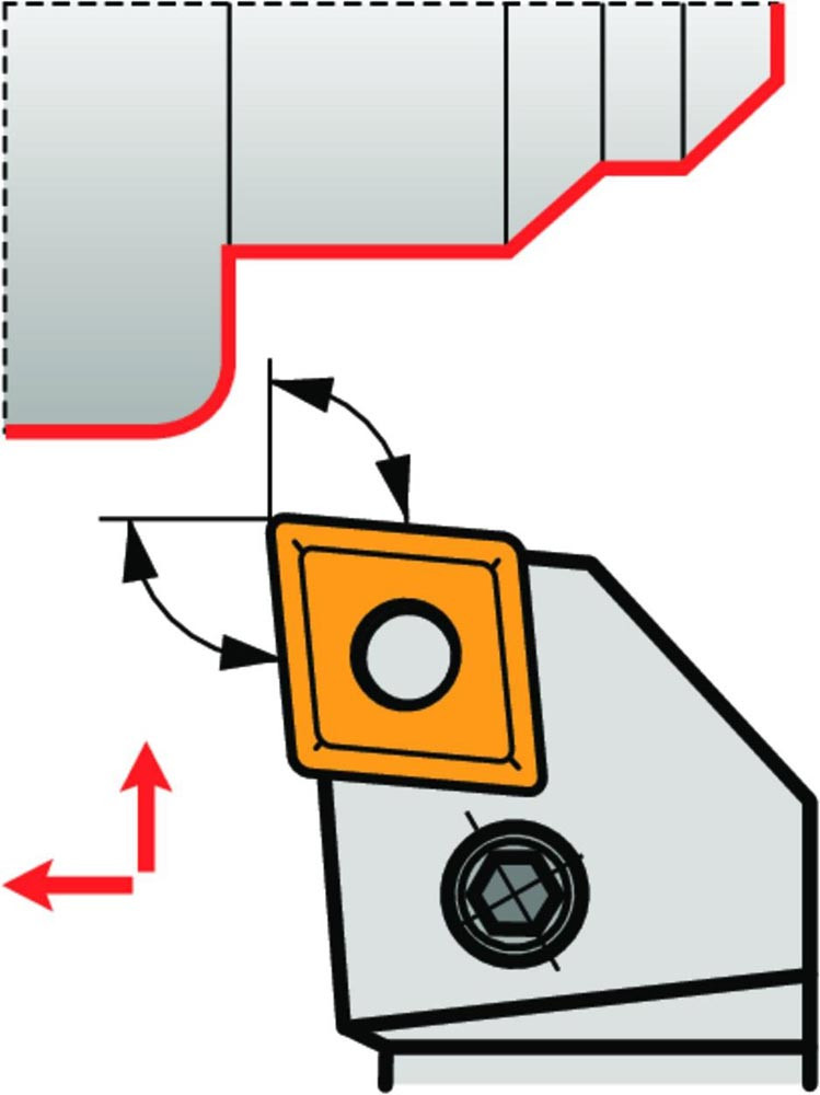 Dreh-Trägerwerkzeug mit Kniehebelklemmung zum spannen von 80° Rhombus negative Wendeschneidplatten mit einem Innenkreisdurchmesser von 19.05mm · 6.35mm Dick (ISO Bezeichnung CN.. 1906.. ) · rechte Ausführung zum 95° Stirn-und Längsdrehen mit abgesetzem Schaft · 40mm Werkzeughöhe x 40mm Breite x 250mm Länge für Kegeldrehen · Stirndrehen mit und ohne Schulter und Längsdrehen mit und ohne Schulter