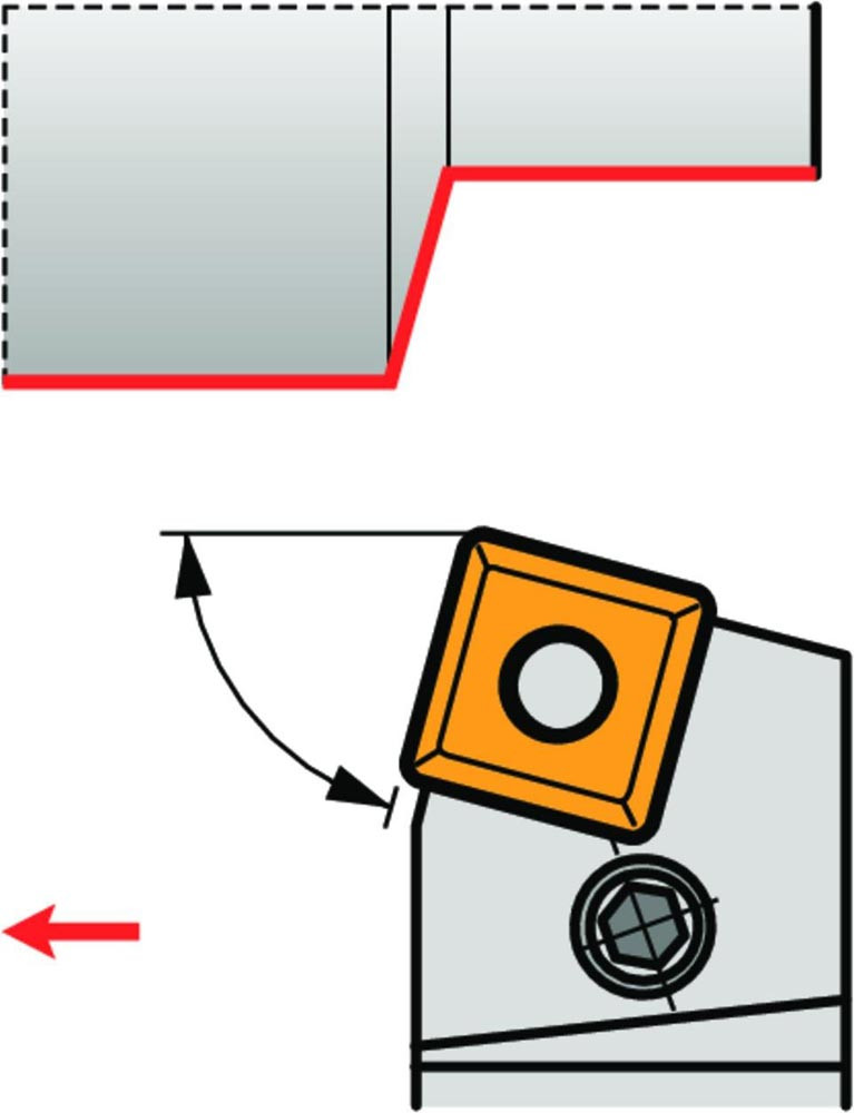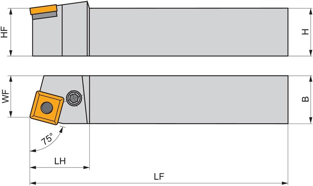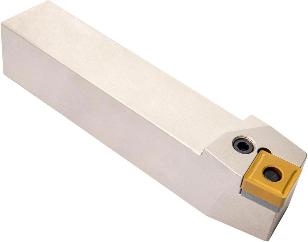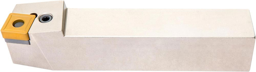 Dreh-Trägerwerkzeug mit Kniehebelklemmung zum spannen von Viereckig negative Wendeschneidplatten mit einem Innenkreisdurchmesser von 12.7mm · 4.76mm Dick (ISO Bezeichnung SN.. 1204.. ) · rechte Ausführung zum 75° Stirndrehen mit Zylinderschaft · 20mm Werkzeughöhe x 20mm Breite x 125mm Länge für Kegeldrehen und Längsdrehen ohne Schulter