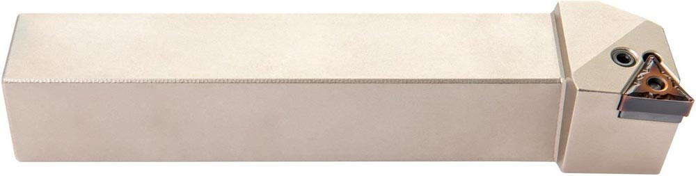 Dreh-Trägerwerkzeug mit Kniehebelklemmung zum spannen von Triangular negative Wendeschneidplatten mit einem Innenkreisdurchmesser von 9.525mm · 4.76mm Dick (ISO Bezeichnung TN.. 1604.. ) · linke Ausführung zum 90° Stirndrehen mit abgesetzem Schaft · 25mm Werkzeughöhe x 25mm Breite x 150mm Länge für Kegeldrehen und Längsdrehen ohne Schulter