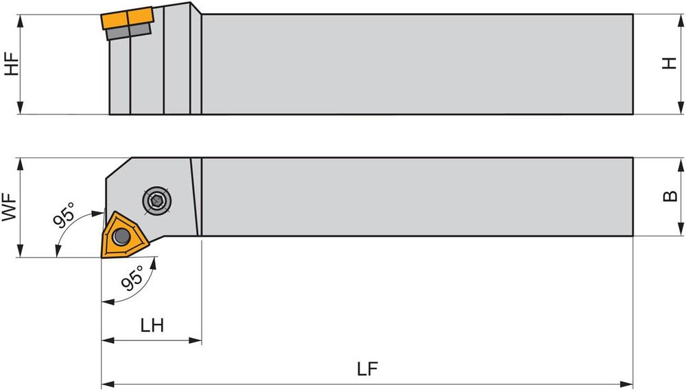 Dreh-Trägerwerkzeug mit Kniehebelklemmung zum spannen von 80° Trigonal negative Wendeschneidplatten mit einem Innenkreisdurchmesser von 12.7mm · 4.76mm Dick (ISO Bezeichnung WN.. 0804.. ) · linke Ausführung zum 95° Stirn-und Längsdrehen mit abgesetzem Schaft · 32mm Werkzeughöhe x 25mm Breite x 170mm Länge für Kegeldrehen · Stirndrehen mit und ohne Schulter und Längsdrehen mit und ohne Schulter