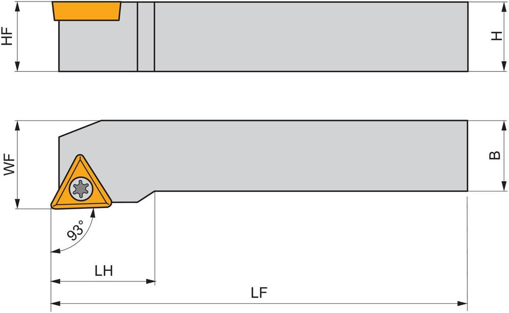 Dreh-Trägerwerkzeug mit Schraubklemmung zum spannen von Triangular positive Wendeschneidplatten mit einem Innenkreisdurchmesser von 9.525mm · 3.97mm Dick (ISO Bezeichnung TC.. 16T3.. ) · rechte Ausführung zum 93° Stirndrehen mit abgesetzem Schaft · 20mm Werkzeughöhe x 20mm Breite x 125mm Länge für Kegeldrehen und Längsdrehen mit und ohne Schulter