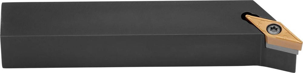 Dreh-Trägerwerkzeug mit Schraubklemmung zum spannen von 35° Rhombus positive Wendeschneidplatten mit einem Innenkreisdurchmesser von 9.525mm · 4.76mm Dick (ISO Bezeichnung VB.. 1604.. oder VC.. 1604.. ) · linke Ausführung zum 107°30' Stirndrehen mit abgesetzem Schaft · 25mm Werkzeughöhe x 25mm Breite x 150mm Länge für Kegeldrehen · Kopierdrehen in einer und mehreren Richtungen und Längsdrehen mit und ohne Schulter
