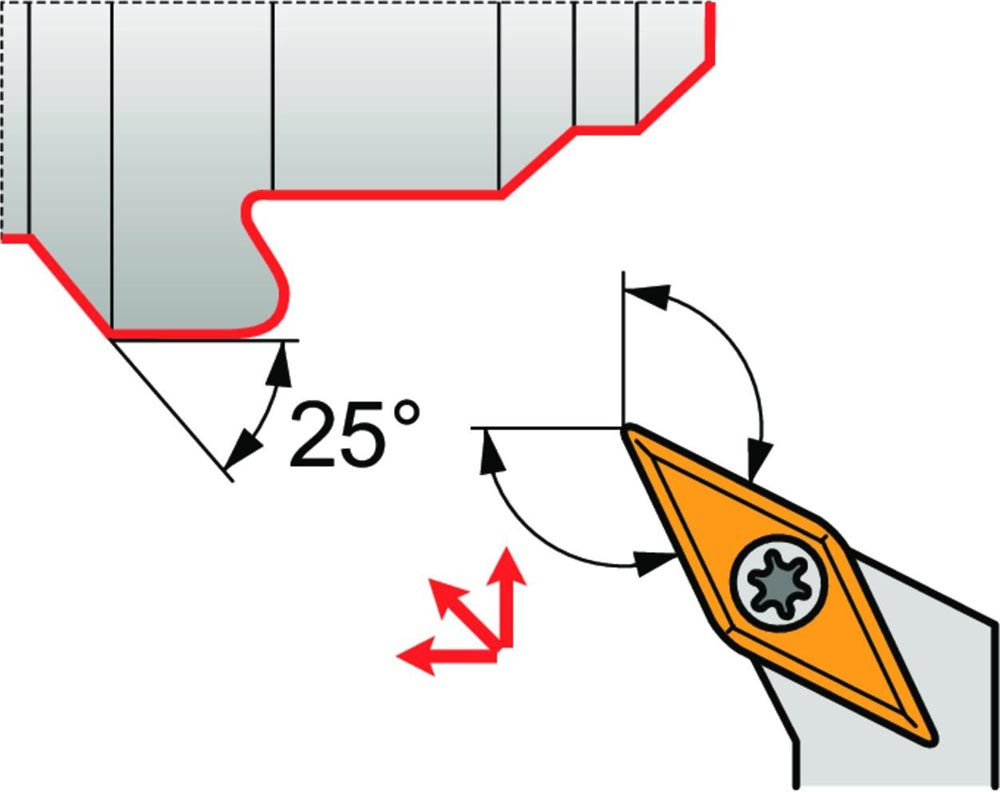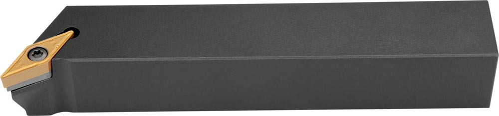 Dreh-Trägerwerkzeug mit Schraubklemmung zum spannen von 35° Rhombus positive Wendeschneidplatten mit einem Innenkreisdurchmesser von 9.525mm · 4.76mm Dick (ISO Bezeichnung VB.. 1604.. oder VC.. 1604.. ) · rechte Ausführung zum 62.5° · linkes und rechtesStirndrehen · 25mm Werkzeughöhe x 25mm Breite x 150mm Länge für Kegeldrehen · Kopierdrehen in einer und mehreren Richtungen und Längsdrehen mit und ohne Schulter
