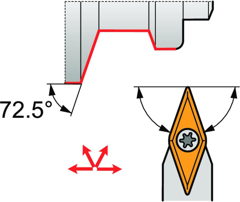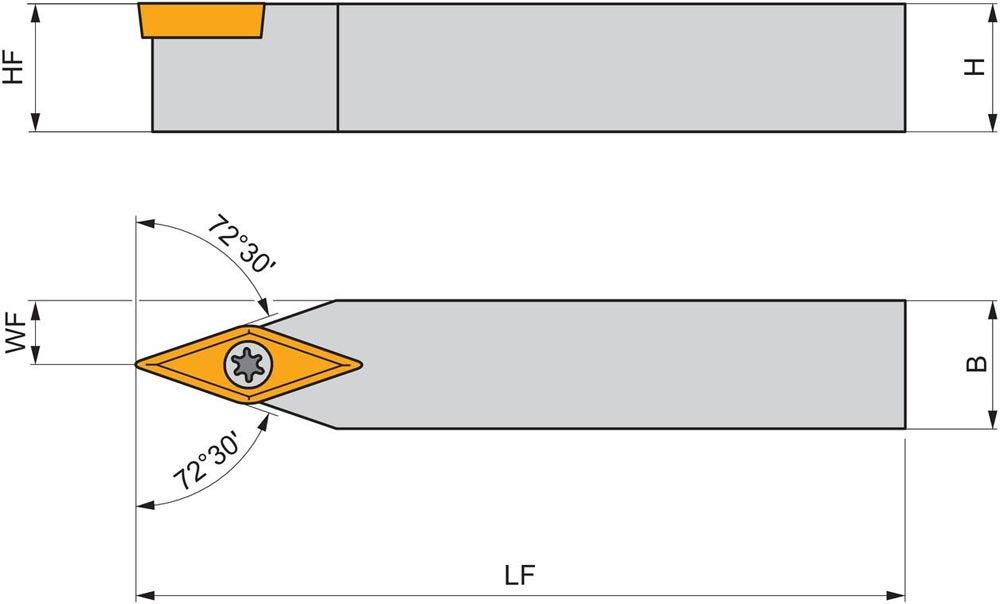 Dreh-Trägerwerkzeug mit Schraubklemmung zum spannen von 35° Rhombus positive Wendeschneidplatten mit einem Innenkreisdurchmesser von 6.35mm · 3.18mm Dick (ISO Bezeichnung VB.. 1103.. ) · neutrale Ausführung zum 72°30' Stirndrehen mit Zylinderschaft · 12mm Werkzeughöhe x 12mm Breite x 80mm Länge für Kegeldrehen · Kopierdrehen in einer und mehreren Richtungen und Längsdrehen ohne Schulter