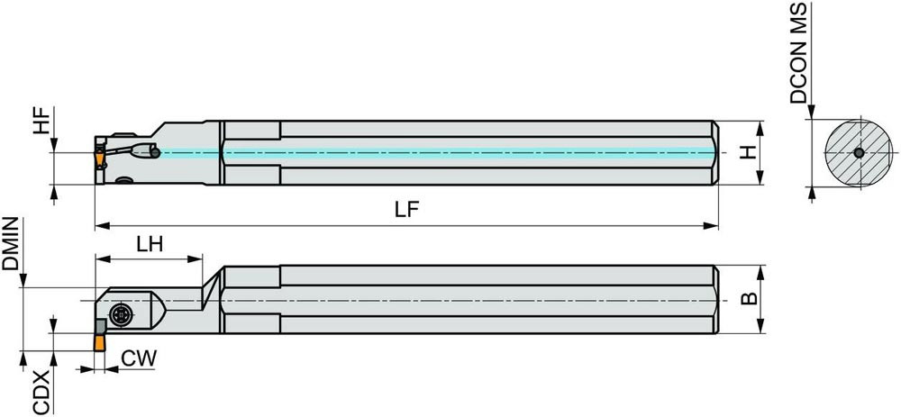 Einstechbohrstange von oben geklemmt zum spannen einer 12.6mm langen doppelt oder einseitigen Wendeschneidplatte mit 3mm Schnittbreite (Bezeichnung LCM. 0313.. ) · linke Ausführung mit Wendeschneidplatte senkrecht zum Schaft für eine maximale Einstechtiefe von 4.5mm · Schaftdurchmesser 20mm und Werkzeuglänge 200mm zum inneres Einstechen und Stechdrehen