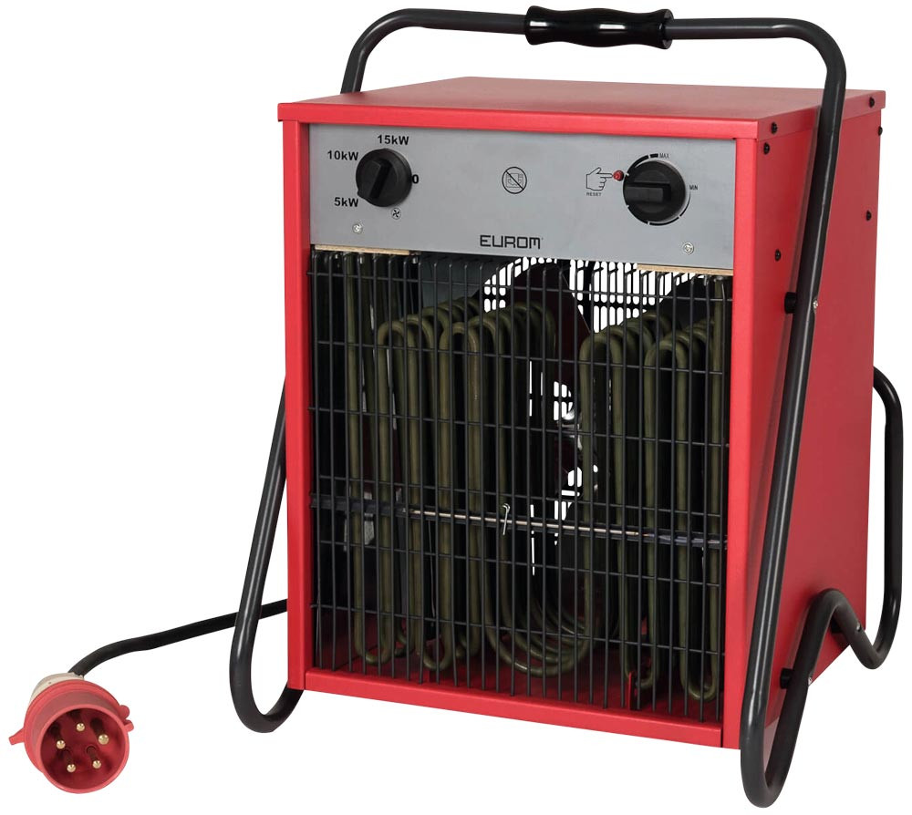 elektrischer Heizlüfter · 400 V · 15000 W · mit Kaltluftventilator und Thermostat · spritzwassergeschützt · robustes Metallgehäuse · Überhitzungsschutz · mit Nachkühlfunktion