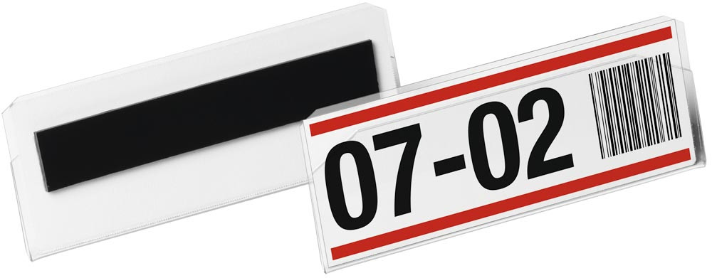 · Etiketten- / Kennzeichnungstasche aus transparenter PET Hartfolie ∙ Schneller Austausch der Einsteckschilder ∙ Scannertauglich und Dokumentenecht · VE 10 Stück
