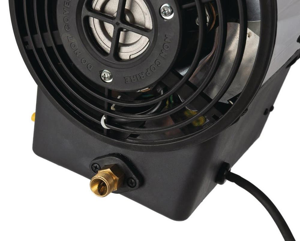 Heißluftpistole · Leistung von 10 kW · Luftverdrängung von 300 m³ pro Stunde dafür · für Räume bis zu 350 m³ · verwendet Sauerstoff zur Verbrennung · sehr hohen Wirkungsgrad von fast 100% · eine gute Belüftung ist wichtig · mit Schlauch und Regler geliefert