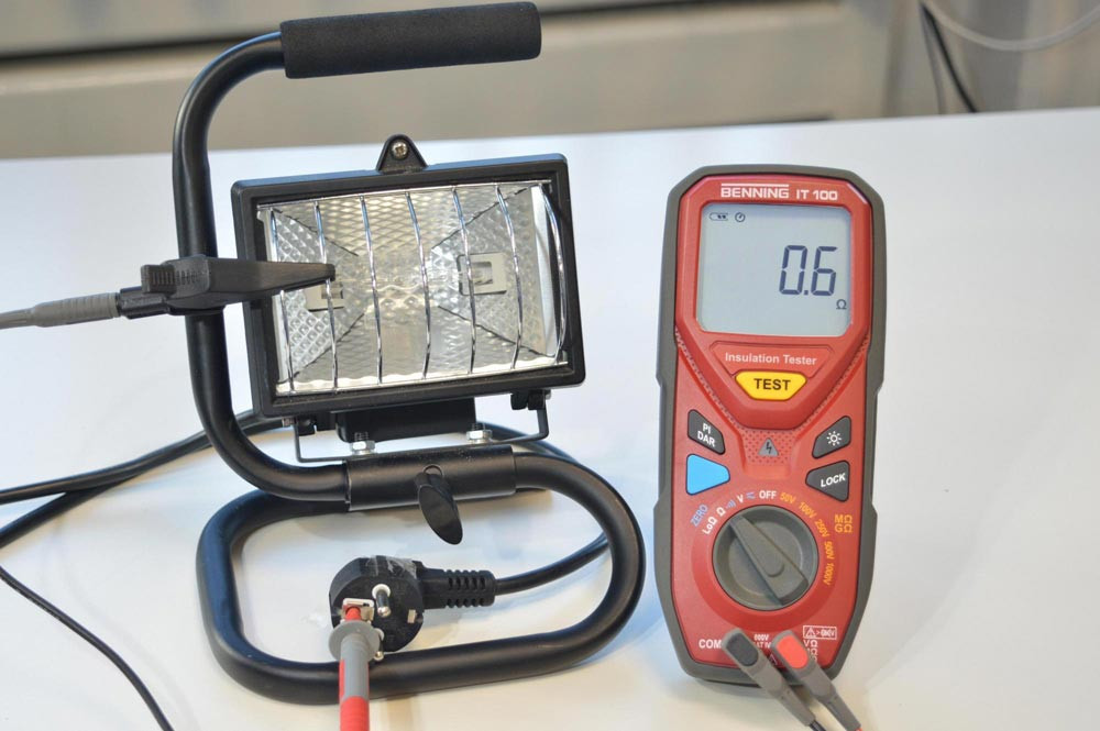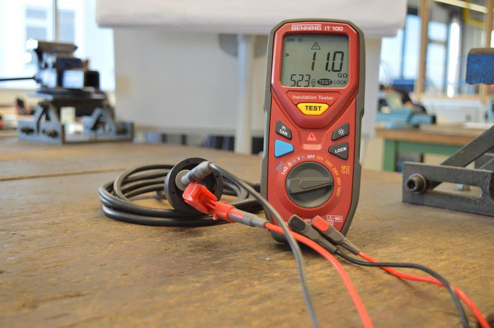 Isolations- und Widerstandsmessgerät für Niederohm- (60 Ω), Isolationswiderstands- (20 GΩ, Prüfspannung 50 V - 1000 V), Widerstands- (200 mA Prüfstrom), Spannungsmessung, Polarisationsindex (PI), dielektrischer Absorptionsgrad (DAR), mit roter LED für Prüf-/ Fremdspannung, automatische Entladung, Nullabgleich, Lock, CAT IV 600 V.