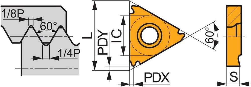 Einseitige Gewindedreh-Wendeschneidplatte · dreieckig mit einem Innenkreisdurchmesser von 9.525mm · für rechtsschneidende Werkzeuge für UN-Innengewinde mit 16TPI · T8030 PVD beschichtet feinkörniges WC-Co-Hartmetall innerhalb der ISO-Substrats-Bereiche P25-P40/M20-M35 und K20-K40 zum zerspanen von Stahl · Edelstahl und Guss
