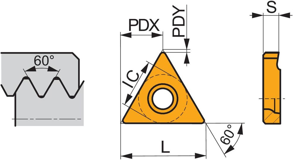 Einseitige Gewindedreh-Wendeschneidplatte · dreieckig mit einem Innenkreisdurchmesser von 12.7mm · für rechts-und linksschneidende Werkzeuge Teilprofil für ISO-metrisches und UN-Außengewinde mit 3.5 bis 5mm Steigung und 7 bis 5TPI · T8030 PVD beschichtet feinkörniges WC-Co-Hartmetall innerhalb der ISO-Substrats-Bereiche P25-P40/M20-M35 und K20-K40 zum zerspanen von Stahl · Edelstahl und Guss in Kombination mit einem SE (RL) -S Gewindedrehwerkzeug