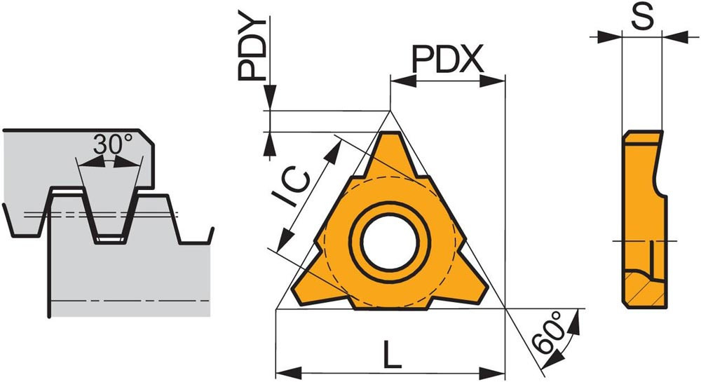 Einseitige Gewindedreh-Wendeschneidplatte · dreieckig mit einem Innenkreisdurchmesser von 12.7mm · für rechts-und linksschneidende Werkzeuge für Trapezförmiges TR-Außengewinde mit 7mm Steigung · T8030 PVD beschichtet feinkörniges WC-Co-Hartmetall innerhalb der ISO-Substrats-Bereiche P25-P40/M20-M35 und K20-K40 zum zerspanen von Stahl · Edelstahl und Guss in Kombination mit einem SE (RL) -S Gewindedrehwerkzeug