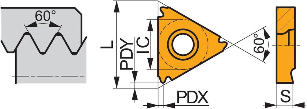 Einseitige Gewindedreh-Wendeschneidplatte · dreieckig mit einem Innenkreisdurchmesser von 12.7mm · für rechtsschneidende Werkzeuge Teilprofil für ISO-metrisches und UN-Innengewinde mit 3.5 bis 5mm Steigung und 7 bis 5TPI · T8030 PVD beschichtet feinkörniges WC-Co-Hartmetall innerhalb der ISO-Substrats-Bereiche P25-P40/M20-M35 und K20-K40 zum zerspanen von Stahl · Edelstahl und Guss