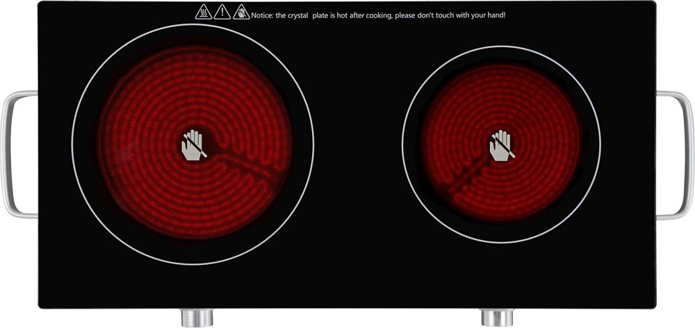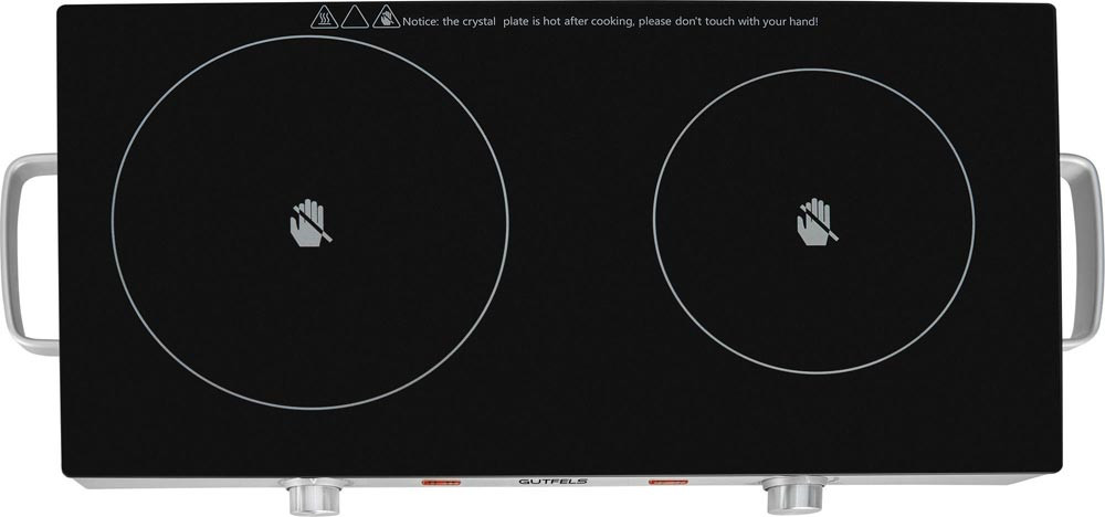 1800 + 1000 Watt Leistung · 2 Kochzonen Ø 20,0 cm und Ø 16,5 cm · stufenlose Temperaturregelung mit Kontrollleuchten · Überhitzungsschutz