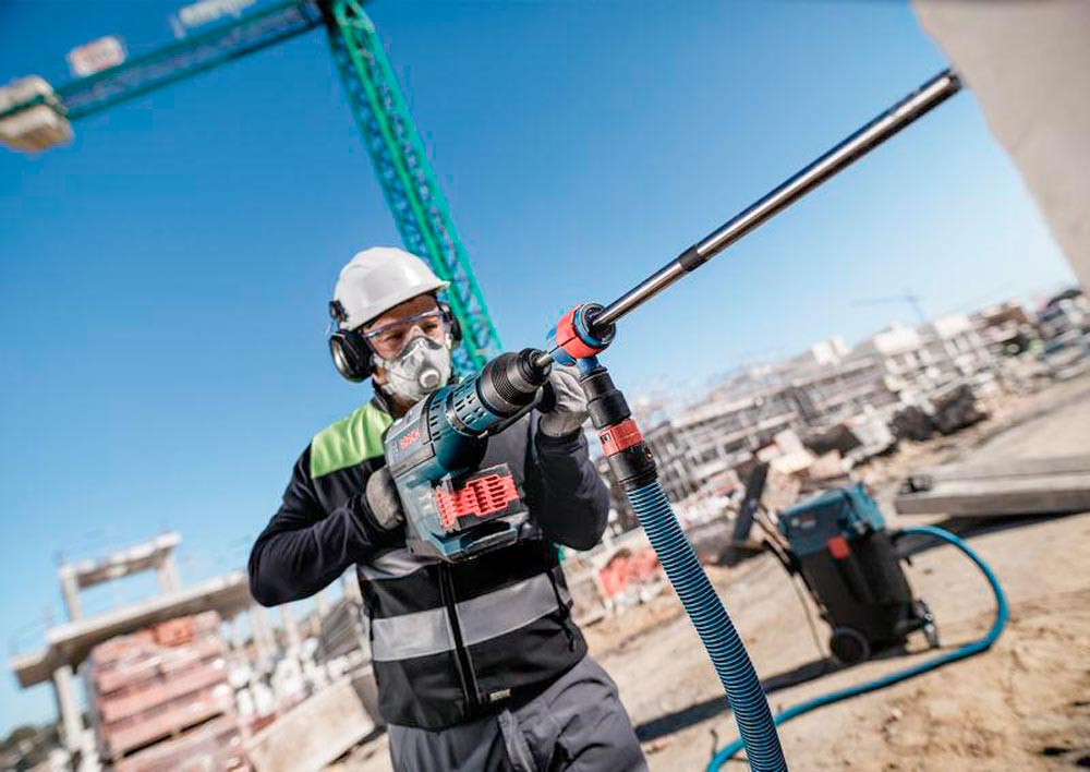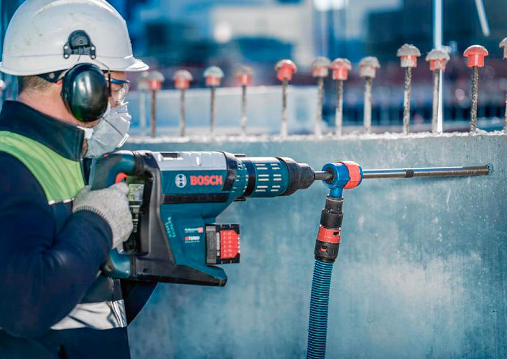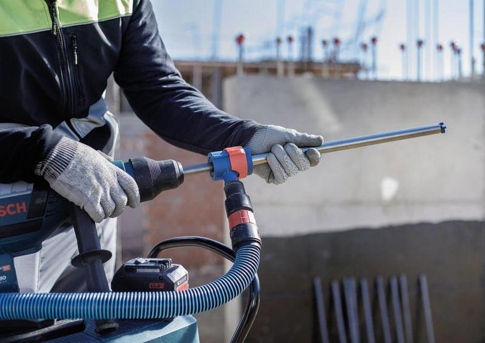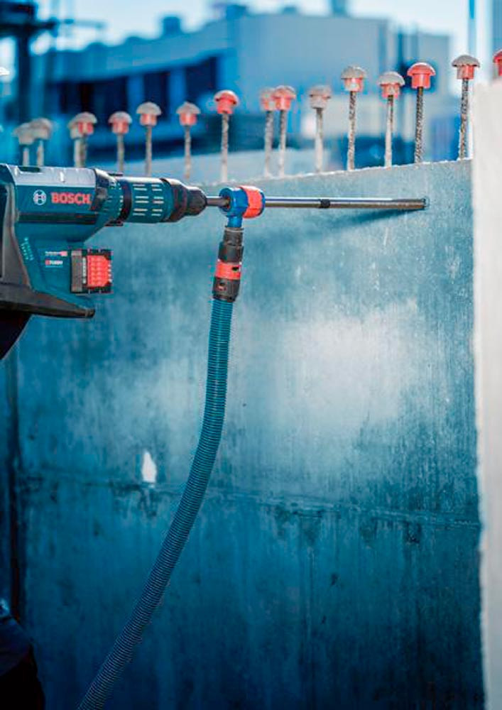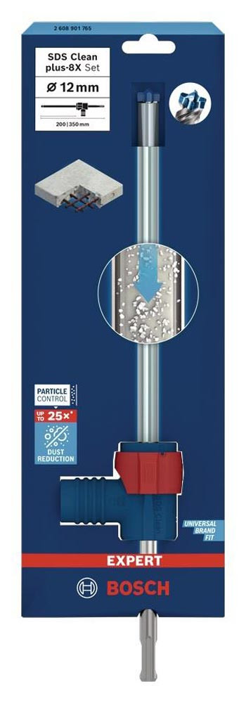 Bohren in Stahlbeton mit verbesserter Staubreduzierung! Durchdringt Stahlbeton mit einem Voll-Carbide-Kopf mit 4 Schneidern Das Bohren präziser Löcher in Beton ist nur ein Schritt bei der Installation chemischer Dübel. Der nächste Schritt besteht in zeitraubenden Reinigungsarbeiten. Mit dem EXPERT SDS Clean plus-8X wird alles anders. Das System bohrt Löcher und entfernt gleichzeitig Staub. Das beschleunigt und vereinfacht die Installation chemischer Dübel. Wir haben das EXPERT SDS Clean plus-8X Set für Bauarbeiter und Installateure entwickelt · die Löcher für chemische Dübel bohren müssen. Der Bohrer ist mit einem 4-Schneider-Vollhartmetallkopf und einem robusten Staubsaugerrohr ausgestattet. Zudem haben wir den SDS Clean plus Anschluss verbaut · der für alle SDS Clean plus-8X Bohrer geeignet ist und sich leicht montieren und abnehmen lässt. Du erhältst also einen leistungsstarken Bohrer · der bei Verstopfung leicht zu reinigen ist (einfach das Absaugrohr vom Bohrer abnehmen) sowie eine neue Technologie zur Staubreduzierung · mit der du Löcher für chemische Dübel schneller vorbereiten kannst. Zudem ist die Luft am Arbeitsplatz sauberer. Alles mit nur einem Zubehör. Hocheffizienter Abtransport von Staub mit Bosch Particle Control