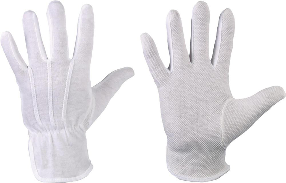 Kat I · Träger: 100% Baumwoll-Trikot, gebleicht · Beschichtung: Micro-Vinyl-Noppen auf der Innenhandfläche· Premium-Qualität · nach OEKO-TEX® STANDARD 100 · mit Schichtel und eingesetztem Daumen · abriebfest · atmungsaktiv · Einsatzbereich: Leichte mechanische Arbeiten der Kategorie I , Produktschutz