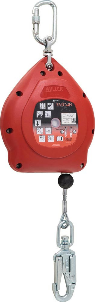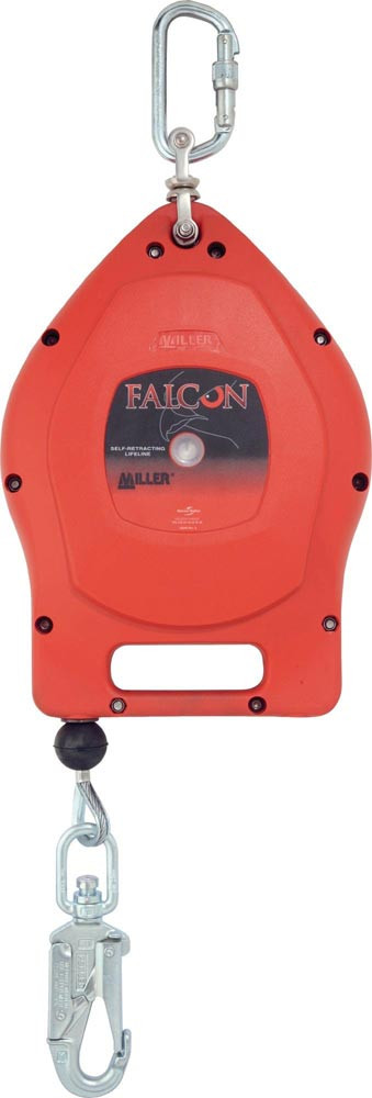 Falcon mit Drahtseil · EN 360 für horizontale Anwendung zugelassen (mit 1 m Stahlseil von Miller) · revisionsfrei: das bedeutet, das Gerät muss nicht jährlich zur Überprüfung zum Hersteller, es ist lediglich eine Sichtprüfung durch einen Sachkundigen erforderlich · gut sichtbarer Sturzindikator · hoch schlagfestes Nylongehäuse · extrem widerstandsfähige · alle inneren Bauteile aus rostfreiem Stahl und Aluminium · 2 Drehwirbel verhindern das Verdrehen des Drahtseils, dadurch längere Lebensdauer · seitlicher Kabelauszug reduziert Verschleiß vom Seil und von der Einlassbuchse · gewährleistet reibungslosen Betrieb bei geringerem Widerstand