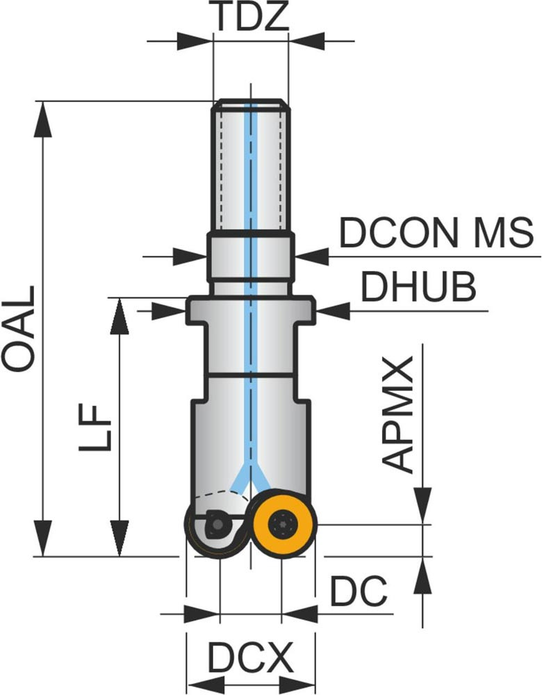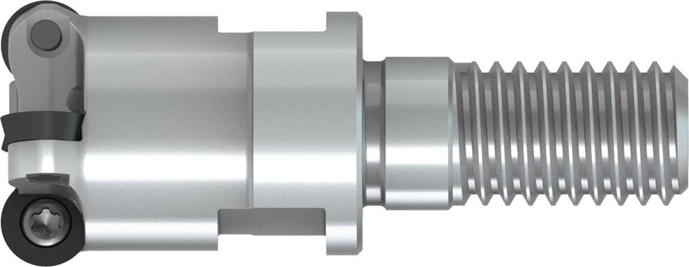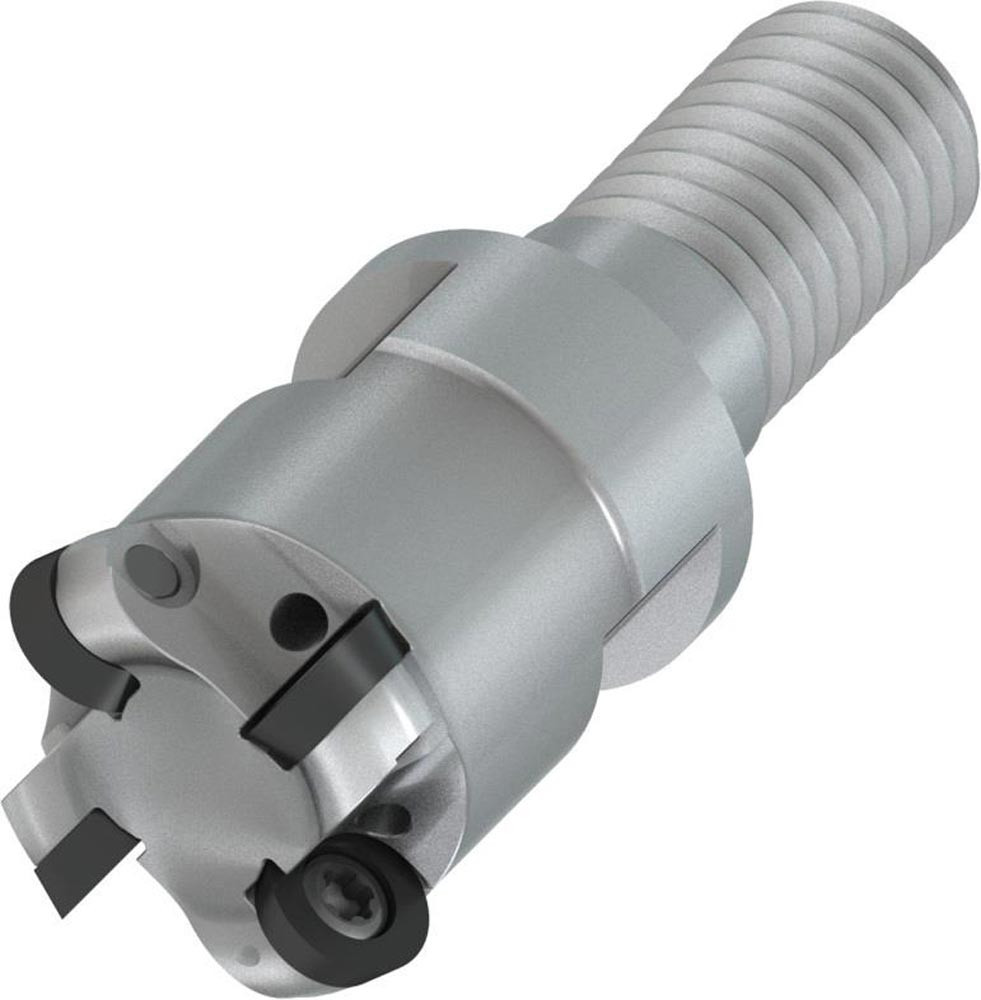 Plan-Kopierfräser mit positv/negativer Geometrie welche 4 aus RD.. 0501MO.. einseitige Wendeschneidplatte · Schneiddurchmesser bis maximal 15mm mit M8 Gewindeschaft für standardisierte modulare Trägerwerkzeuge · 20mm funktional und 38mm Einsatzlänge · durchgehende Kühlung zum Planfräsen · Kopierfräsen · Rampen · progressiven Tauchfräsen und helikalen Fräsen mit einer maximalen Schnitttiefe von 1.5mm