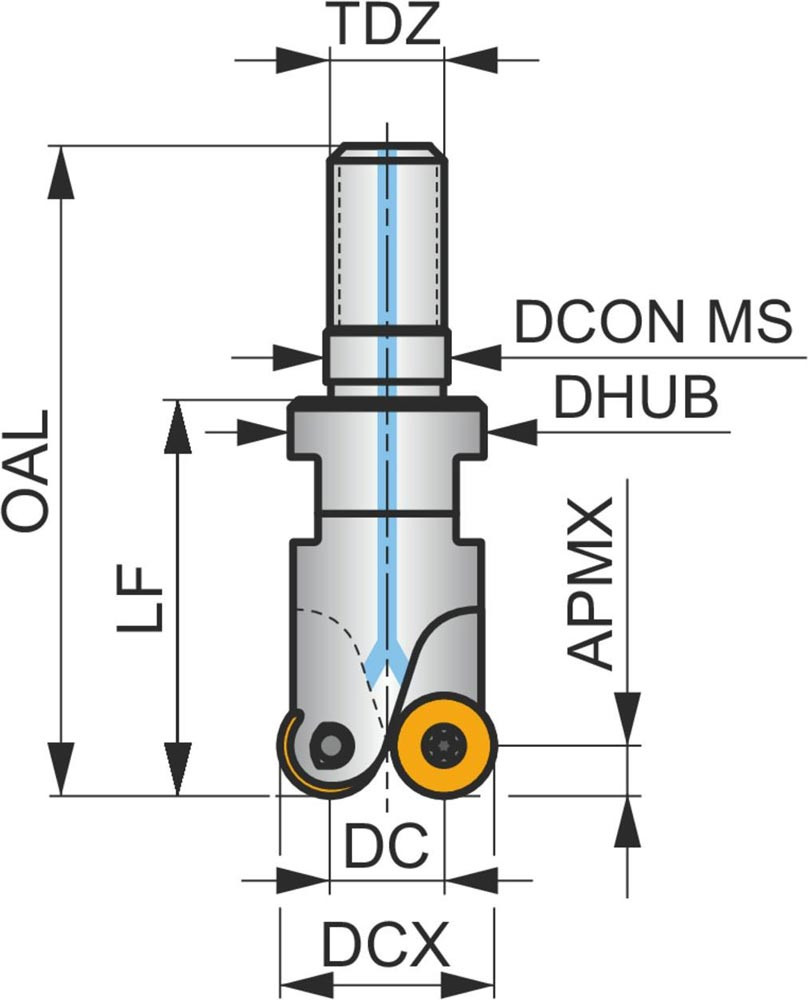 Plan-Kopierfräser mit doppelt negativer Geometrie welche 4 aus RD.. 0702MO.. oder RD.. 07T1MO.. einseitige Wendeschneidplatte · Schneiddurchmesser bis maximal 20mm mit M10 Gewindeschaft für standardisierte modulare Trägerwerkzeuge · 28mm funktional und 47mm Einsatzlänge · durchgehende Kühlung zum Planfräsen · Kopierfräsen · Rampen · progressiven Tauchfräsen und helikalen Fräsen mit einer maximalen Schnitttiefe von 2mm