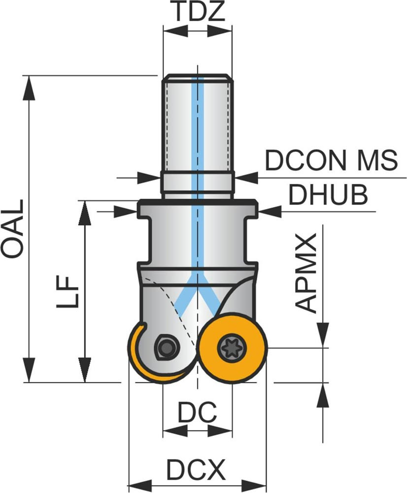 Plan-Kopierfräser mit doppelt negativer Geometrie welche 3 aus RD.. 12T3MOT oder RDHT 12T3MO-FA einseitige Wendeschneidplatte · Schneiddurchmesser bis maximal 35mm mit M16 Gewindeschaft für standardisierte modulare Trägerwerkzeuge · 42mm funktional und 65mm Einsatzlänge · durchgehende Kühlung zum Planfräsen · Kopierfräsen · Rampen · progressiven Tauchfräsen und helikalen Fräsen mit einer maximalen Schnitttiefe von 3mm