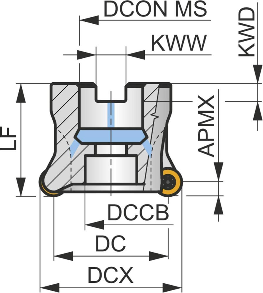 Kopier-Planfräser mit doppelt negativer Geometrie zum spannen von 7 Stück RCMT 10T3MO.. einseitigen Wendeschneidplatten · Schnittdurchmesser 63mm mit 22mm Verbindungsbohrung gemäß DIN 8030-A · 40mm Überstandslänge · Kühlkanalbohrung zum Planfräsen · Kopierfräsen · Rampen · Helikalen Fräsen und progressiven Eintauchen mit einer maximalen Schnitttiefe von 5.0mm