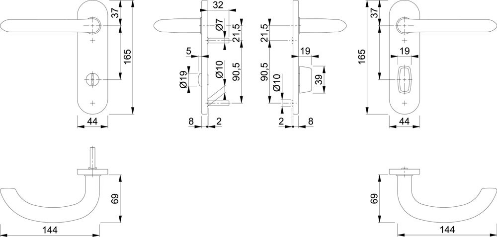 Innentür-Kurzschild-Garnitur geprüft nach DIN EN 1906 (Gebrauchs-Kategorie Klasse 3) · Türgriffe mit Schnellstift-Verbindung (mit 8 mm Vollstift) für Türstärke 37 - 42 mm und Rückholfeder · verdeckte Verschraubung · Anschlagrichtung DIN links / rechts