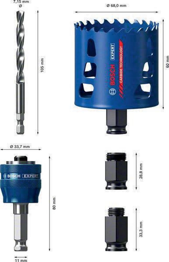 lange Lebensdauer beim Schneiden von Löchern in verschiedenen Materialen · mit Bosch Carbide Technology · perfekte Schnittform · ideal für schwere Aufgaben · einsatzbar in Holz, Metall, Edelstahl, Ziegelstein, weiche Fliesen und verstärkte Kunststoffe · zur Verwendung mit dem Power Change Plus-Schnellspann-Adapter