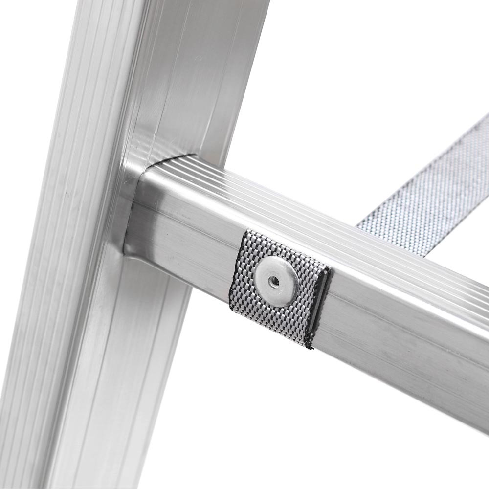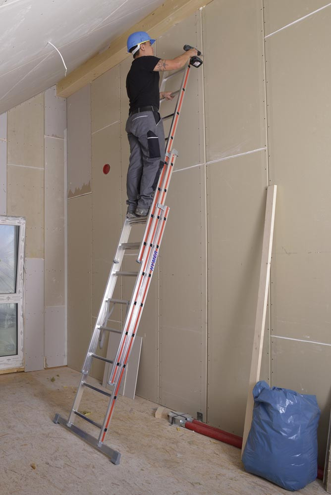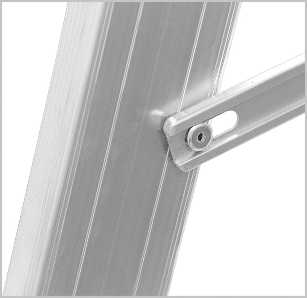 ∙ Kombinierbare Steh- und Schiebeleitern mit vielen verschiedenen Verwendungsmöglichkeiten ∙ Hohe Standsicherheit durch stabile Fußverbreiterung ∙ Hochfeste Perlongurte ∙ Starre Strebe als Spreizsicherung ∙ Aufstellen der Leiter in Treppenstellung mit Zubehör ist möglich (bis Größe 3x10) ∙ Hohe Rutschsicherheit durch ausgeprägte Profilierung der Sprossen ∙ Leiterfüße mit Holm verpresst ∙ Massive Stahlbeschläge · Zulässige Belastung 150 kg · Entspricht EN 131