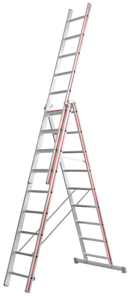Mehrzweckleiter, 3-teilig, 3x11 Sprossen, Länge als Anlegeleiter 7670 mm, senkr. Höhe mit Steckteil 5110 mm, Perlongurte, Gewicht 22 kg E490625