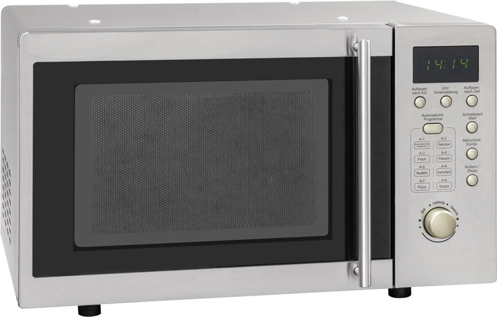 Timer - komfortabel mit digitaler Uhrzeit- und Funktionsanzeige · Autokochprogramme - mühelos voreingestellte Programme nutzen · 1000 Watt - starke Grillleistung · 5 Leistungsstufen für die individuelle Mikrowellenstufe · 20 Liter Edelstahlgarraum · lackiert, Gehäuse Silber, Front Inox · Drehteller 24,5cm Ø · Kabellänge 1 m