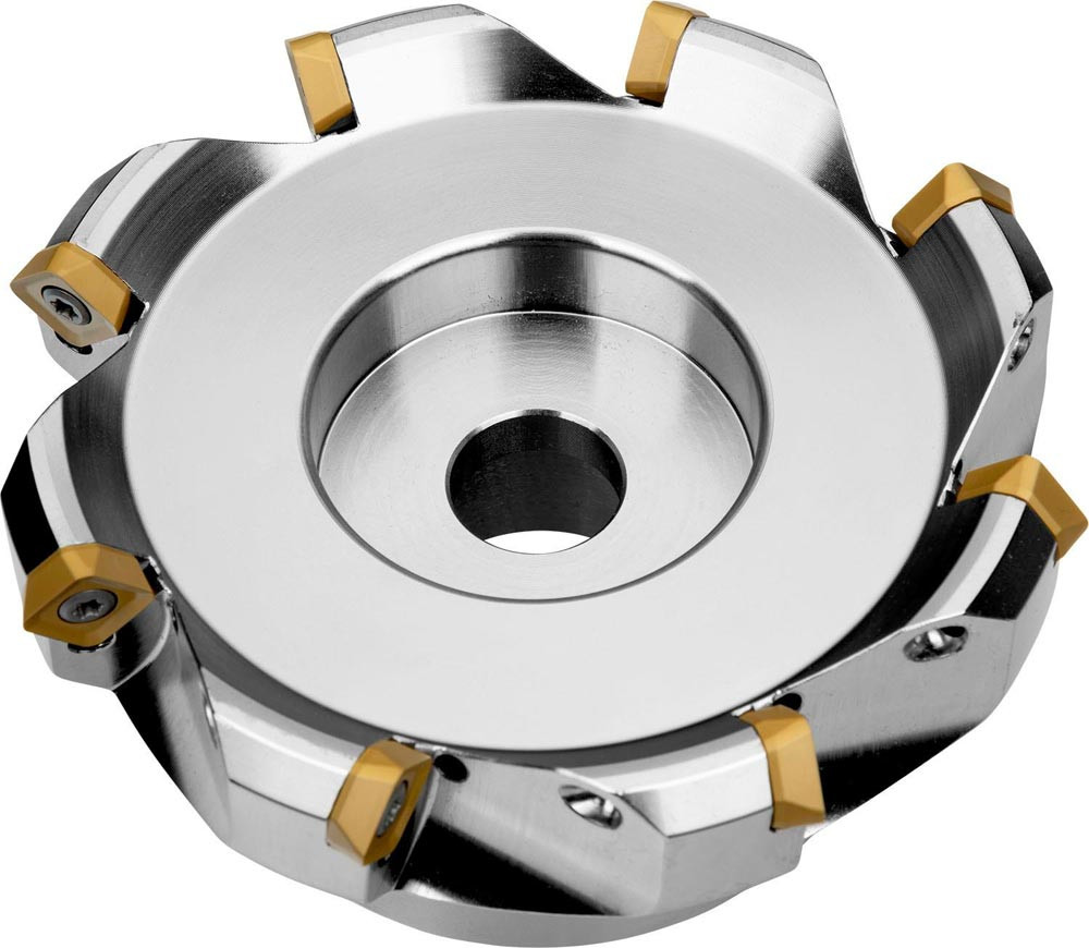 Planfräser mit positiver/negativer Geometrie zum spannen von 8 Stück SNKT 1205AZ.. oder SNMT 1205AZ.. doppelseitigen Wendeschneidplatten · Schnittdurchmesser 125 bis maximal 140mm mit 45° Anstellwinkel und 40mm Verbindungsbohrung gemäß DIN 8030-A · 63mm Überstandslänge · Kühlkanalbohrung zum Planfräsen und Entgratfräsen mit einer maximalen Schnitttiefe von 6.5mm