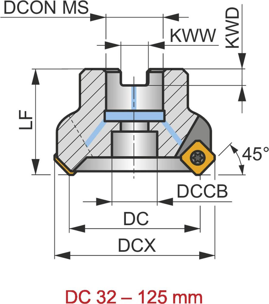 Planfräser mit positiver/negativer Geometrie zum spannen von 12 Stück SEET 09T3AF.. oder SEMT 09T3AF.. einseitigen Wendeschneidplatten · Schnittdurchmesser 125 bis maximal 134.5mm mit 45° Anstellwinkel und 40mm Verbindungsbohrung gemäß DIN 8030-A · 63mm Überstandslänge · Kühlkanalbohrung und ungleiche Teilung zum Planfräsen und Entgratfräsen mit einer maximalen Schnitttiefe von 4.5mm