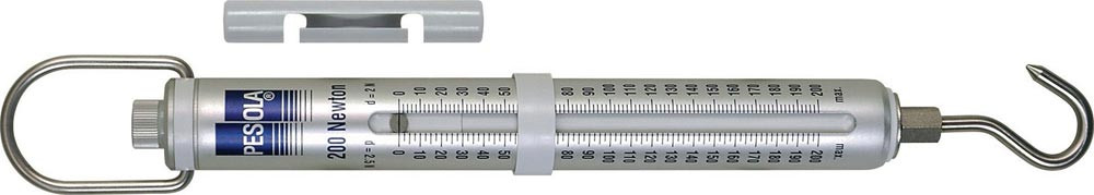 Newton · genaue handliche Federwaage mit robustem, eloxiertem und abriebfreiem Aluminiumrohr sowie langer Präzisionsskala mit hoher Auflösung · Tara- und Nullstellvorrichtung sowie dreh- und schwenkbarer Aufhängebügel · Haken dreh- und schwenkbar, sowie durch verschiedenes Zubehör austauschbar · Aufhängeelemente aus Inox · Schleppzeiger (z.B. für stehende Anzeige bei Zerreissproben bis maximal 30 kg) und handlicher, abnehmbarer Handgriff im Lieferumfang enthalten · Messmittel zur Gewichtsbestimmung und Zugkraftmessung