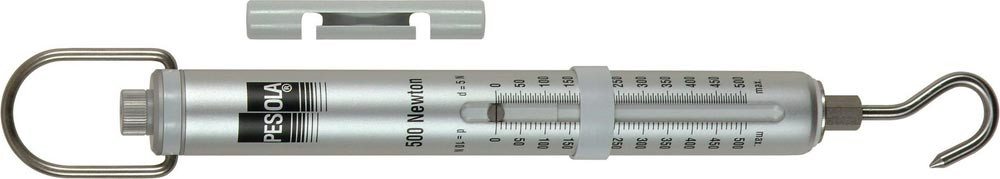 Newton · genaue handliche Federwaage mit robustem, eloxiertem und abriebfreiem Aluminiumrohr sowie langer Präzisionsskala mit hoher Auflösung · Tara- und Nullstellvorrichtung sowie dreh- und schwenkbarer Aufhängebügel · Haken dreh- und schwenkbar, sowie durch verschiedenes Zubehör austauschbar · Aufhängeelemente aus Inox · Schleppzeiger (z.B. für stehende Anzeige bei Zerreissproben bis maximal 30 kg) und handlicher, abnehmbarer Handgriff im Lieferumfang enthalten · Messmittel zur Gewichtsbestimmung und Zugkraftmessung